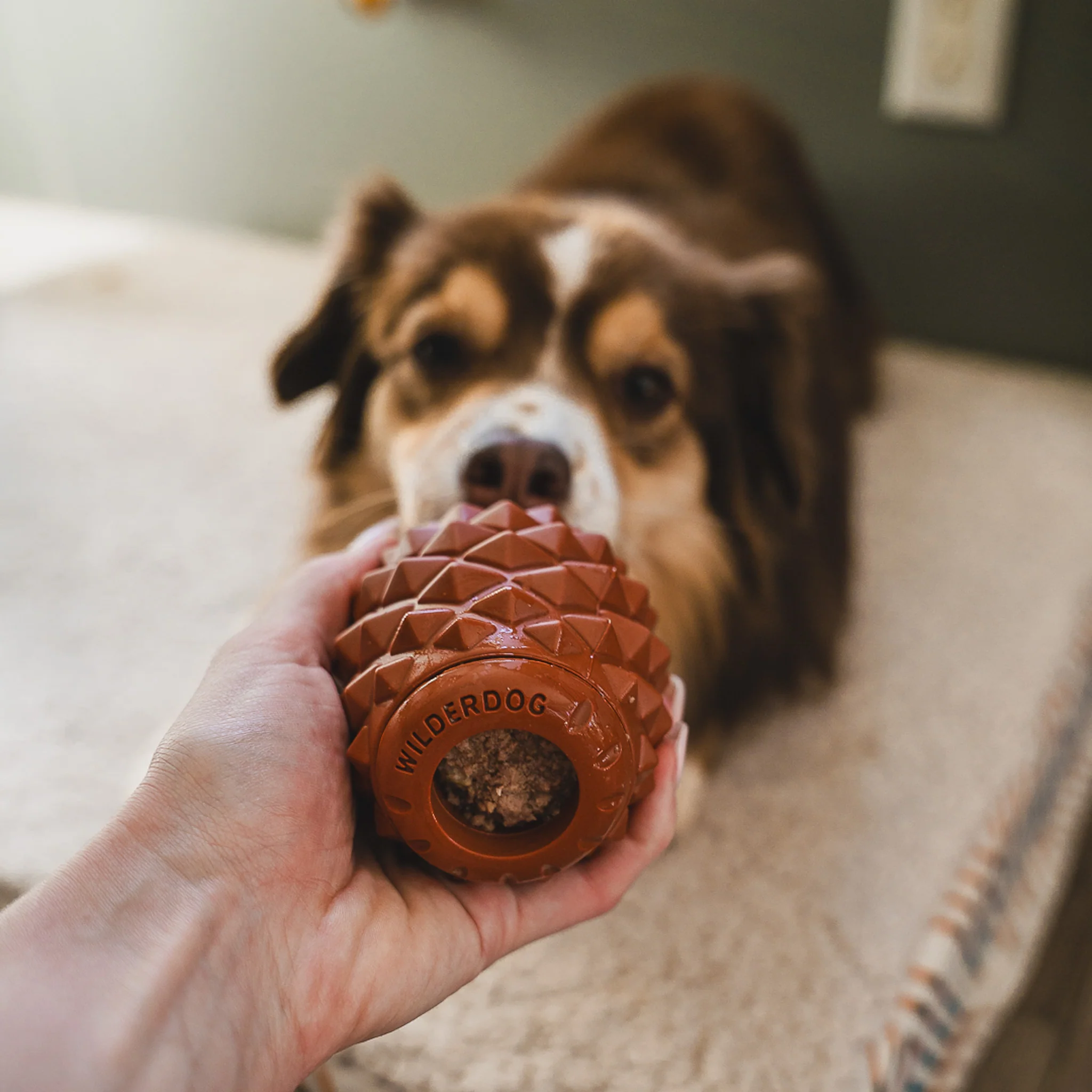 Prepare and freeze treats, then insert into the pinecone for up to 30 minutes of enriching, stimulating fun. The opposite end of the Conifur toy can be filled with kibble or small training treats, serving as an extra puzzle to keep your pup busy for additional time once they finish the frozen treat.